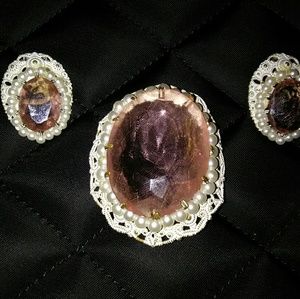 🎉This set is so gorgeous It belong to my great grandmother. Its a huge pink stone diamond cut with a white metal doiley like design surrounding it along with an outline of pearls all in place. Its totally clear pink no bubbles. The earrings are clip on. The pink Stones are the same perfect pink color throughout.💍💎 Great Christmas or wedding gift
