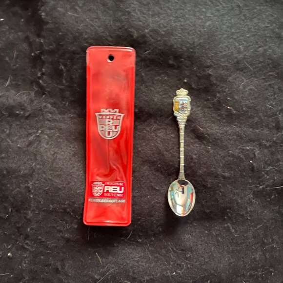 It is an original Wappen RUE Feinsilberauflage. ‘Feinsilberauflage’ translate to “fine silver plating.” The crest is an enamel representation of a german town and topped with a crown.