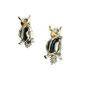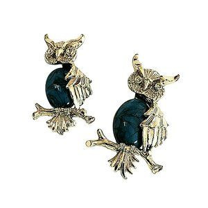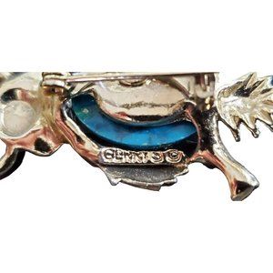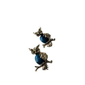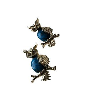 Beautiful pair of owl brooches. These brooches are stamped Gerry's. They are silver tone with blue stone. Smaller brooch measures approximately 3/4" x 1 1/4". The larger brooch measures approximately 1" x 1 1/2". Each owl has clear rhinestone eyes.