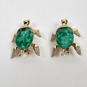 Vintage Gerry's Signed Turtle Scatter Pin Marble Green Glass Cabochon Faux Stone Rhinestone Eye Set of 2. Gold Tone Metal. Measure 1 1/4" L. In Very Good Condition with Minimal Wear.