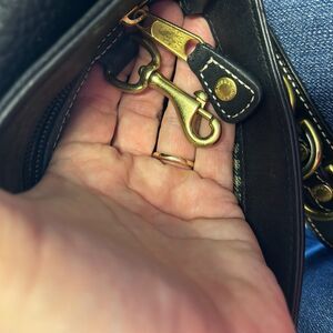Interior: 2 open pockets, leather card slot, keyholder clasp, zip pocket
