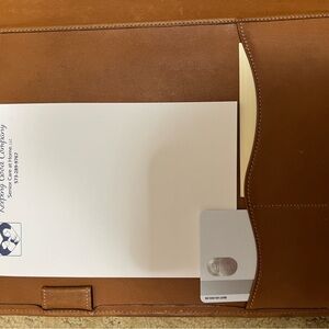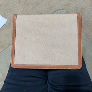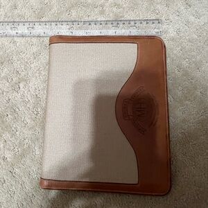This stylish padded portfolio features two interior pockets, pen loop and slit for notepad. Vintage portfolio is small approximately 7”x9” and features a sophisticated tan leather trim with a cream canvas body.
