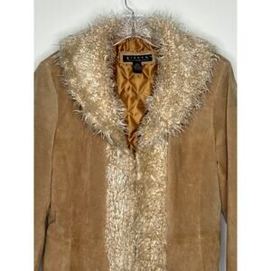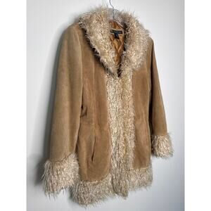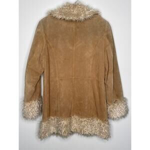 Giacca genuine suede coat with plush faux shearling trim. Features tan pig-suede leather shell, quilted satin lining, and soft cream shag at the collar, cuffs, and hem. Warm, statement-making, and effortlessly 70s boho chic. Size Large. Vintage-inspired Giacca genuine suede coat with plush faux shearling trim. Features tan pig-suede leather shell, quilted satin lining, and soft cream shag at the collar, cuffs, and hem. Warm, statement-making, and effortlessly 70s boho chic. Perfect for fans of the Penny Lane / Almost Famous aesthetic or Y2K retro style.