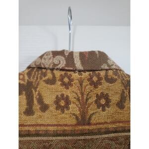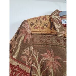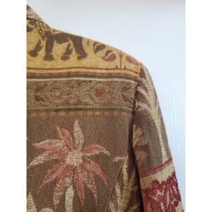 Style: India/Desert inspired woven tapestry jacket. Traditional collar with full-zip front closure. Shoulder pads. Long sleeves. Fully lined with satin-like material. Heavy weight. Pattern includes palm trees, elephants, trees, and geometric designs. Very good quality. 86% Rayon, 11% Cotton, 3% Polyester. Lining is 100% Acetate. Made in USA. Dry Clean Only.