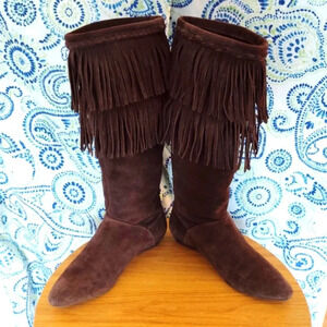 Double layer of fringe gives these rich chocolate brown suede over-the-calf boots beautiful movement and timeless style. Braided trim at tops. Crafted in Brazil of a supple yet sturdy suede.