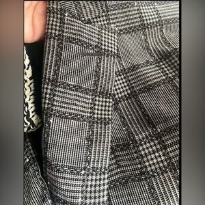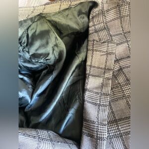 black and gray square jacket, the measurement label fell off and I'm not sure if it is a medium or small size. but the measurements are as follows: from shoulder to shoulder they are 19 inches, from armpit to armpit they are 19 inches, from shoulder to waist length 30 inches, and from the sleeve from shoulder to cuff is 25 inches. gently used bag in excellent condition