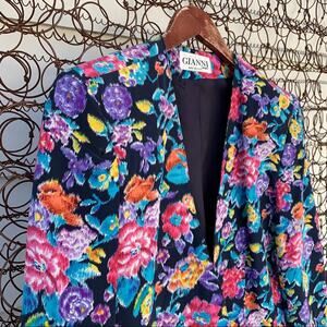 Vintage 90s Gianni floral silk single button blazer. Has shoulder pads. Absolutely a statement piece. Dress up a casual pair of jeans and sneakers with this blazer!