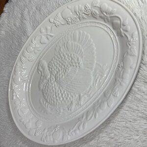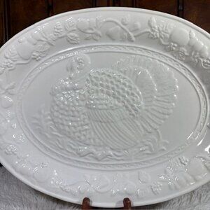 Blending heirloom elegance and modern function, this oval turkey platter is crafted with a raised, relief molded turkey design, stunning ivory palette, and detailed trim highlighting the artwork beautifully—complementing any dinnerware.