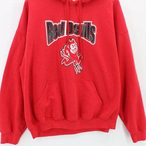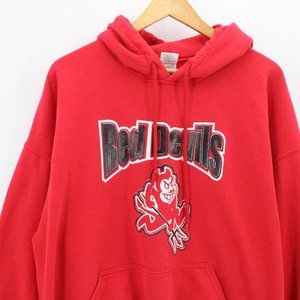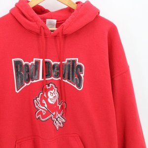 Vintage Gildan Hoodie Mens Red Pullover Red Devils Big Logo Front Cotton Size XL