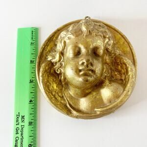 Vintage Gilded Gold Angel Ornament 5" Circle 3D Relief Christmas Blow Mold.