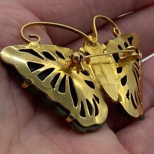This exquisite vintage brooch features a gilded goldtone finish with intricately carved jade green wings, designed in a captivating butterfly shape. Perfect for adding a touch of elegance to any outfit.