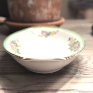 Vintage Gilded Hand Painted Floral Oval Relish Tray by Celebrate. Gorgeous pink, yellow, blue, and green florals around the edges of the dish and trimmed in mint green and gold. Discontinued piece.