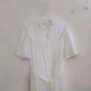 Indulge in the elegance and charm of this vintage Gilead nightgown and robe set. The delicate white color and Victorian-inspired design make it a unique and timeless addition to your sleepwear collection. The set includes a small nightgown with intricate detailing and a medium robe, both made with a soft 65% polyester and 35% cotton blend for maximum comfort. This original Gilead Peinior set is a must-have for vintage clothing enthusiasts. The United States-made nightgown and robe feature a regular size fit, and the color and quality are sure to impress. Add this stunning piece to your wardrobe and experience a touch of vintage luxury every night.