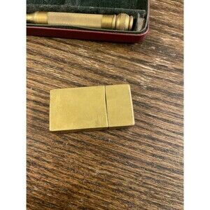 Very cool. Red case with green velvet lining includes all the pieces and one extra unused razor blade. Made in the USA. Unfortunately, the barrel of the razor handle has cracked. Still a cool item for a collector or if someone has several of these you could get it functioning again. The razor cant screw down because the tension isnt there in the handle. Box itself measures approximately 4 x 2 by about .75 inches.