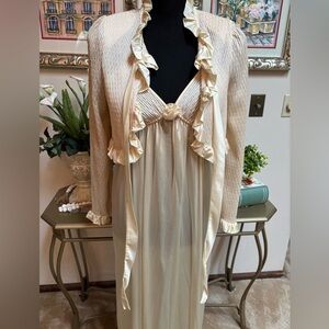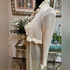 Indulge in the elegance of this cream lingerie set by Gilligan & O'Malley, featuring a flowing silhouette and delicate ruffle details. The full-length nightgown dress and matching top, crafted from a light, airy fabric, offers a luxurious feel ,perfect for special occasions. Embrace timeless sophistication with this beautifully designed ensemble. Perfect for a honeymoon , bridesmaid parties, boudoir pics etc. Just a beautiful silky, sexy set. Great condition.