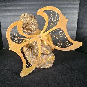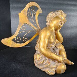 A very nice vintage resting angel, most likely cast resin with gold and guilt finish and gold medal wings. The wings are removable. This sweet cherub measures 10 inches tall (excluding wings) by 7 inches wide by 8 inches deep. Not sure of the age of this piece, but would guess 1980s. The guilt is antiqued to make it look worn in some places. Condition is very good. There are a few marks on the bottom. A very sweet attractive piece. Non smoking pet free home. @ER FLOOR