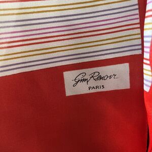 This vintage Gim Renoir rectangle scarf is a stylish addition to any wardrobe. The navy, red, and white square dots pattern is eye-catching and perfect for any occasion. The scarf is signed by the designer and is made of a silky feel material, adding to its luxurious look.
