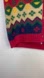 Red background with a fun sort of fair isle pattern in tan, dark green, brown, gold and navy blue.