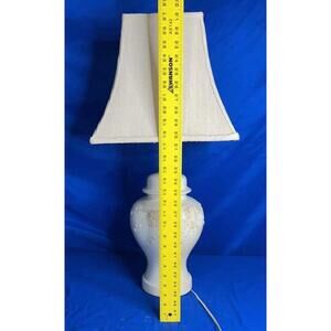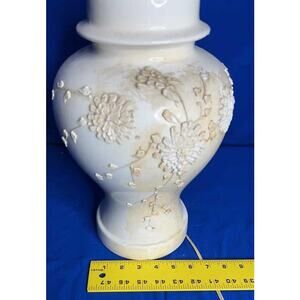 This vintage ginger jar style table lamp combines timeless design with functional charm. The ceramic base features a raised floral relief pattern highlighted by a beige antiqued wash that draws the eye to its intricate detailing.