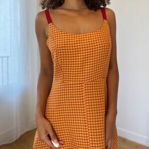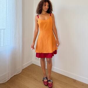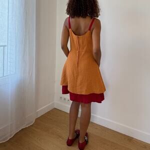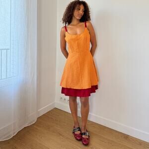 Playful orange-red gingham with contrast straps and a double-layer hem (scalloped overskirt over solid red). Princess-seamed bodice and flared A-line silhouette with zipper closure. Sourced in Europe.
