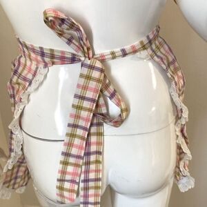 Pink, purple & olive green plaid printed apron measures 17” long.