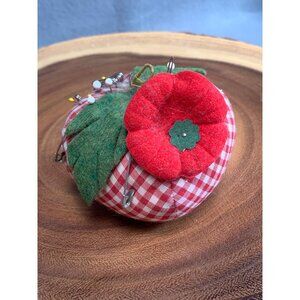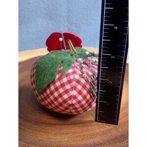 Vintage Gingham Tomato Pin Cushion with Safety Pins & Pins