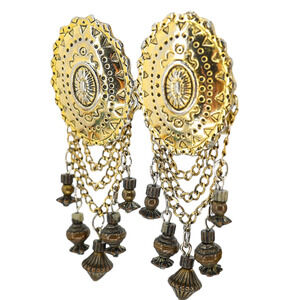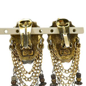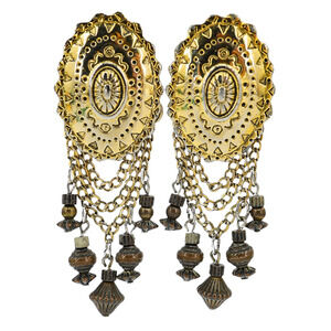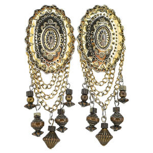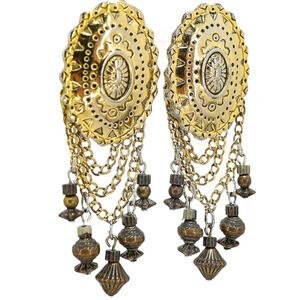 Vintage Ginnie Johansen GJD clip-on earrings featuring a bold concho-style design with multi-chain dangles and sculptural bead drops. The oval gold-tone tops are etched with geometric and sunburst motifs, accented by silver and bronze-tone chains that create rich boho texture and movement. Measuring approximately 3 inches long, these statement earrings embody 1980s Southwestern and Boho Chic aesthetics — perfect for collectors or anyone who loves dramatic vintage accessories.