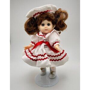 A charming doll dressed in a vintage sailor outfit, featuring intricate red and white details. A delightful piece for any collection.