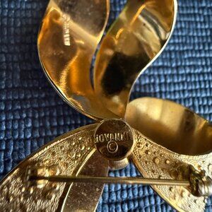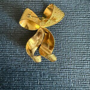 Gold Vintage Giovanni Bow Brooch Dimensions: 2.5 inches in height and 1.5 inches wide. The pin on the back is in excellent working condition and is firmly attached. The brooch is stamped with the name “Giovanni” in five separate spots.