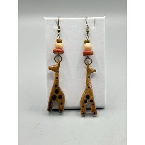 Vintage Giraffe Earrings Carved Hand Painted Wood Dangles Animal Ethnic Jewelry