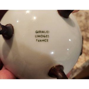This vintage Trinket bowl showcases timeless elegance with its autumn leaf pattern by Giraud Limoges. Crafted in France, it features delicate porcelain and ornate handles, embodying fine artistry. A charming piece for collectors or enhancing classic table settings.