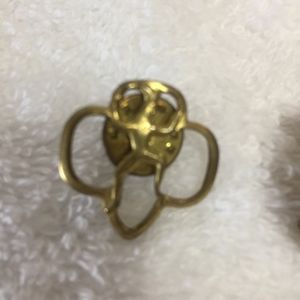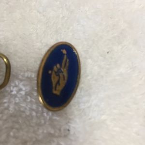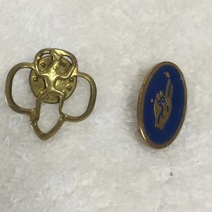 Vintage Girl Scout Brownie pins from 1960s. (1) Regular Brownie pin; (1) 2 finger salute pin with little chip on enamel on top of finger to the left. See pictures. Tarnished from age. See pictures of back of pins.