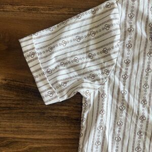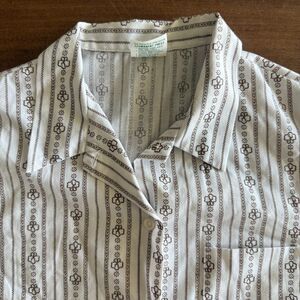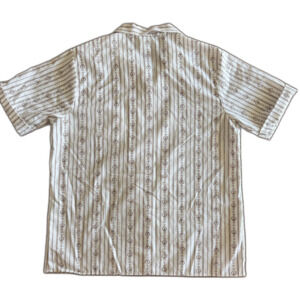 Collared, short sleeve with hem folded up, front button closure, left chest pocket, off-white background with brown vertical striped print.