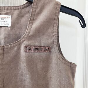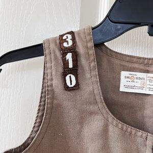 Vintage Girl Scouts Brownie Uniform Jumper Dress Front Zipper Girls Size 12. Vintage Girl Scout of America Brownie Uniform Jumper dress, half zipper down the front and has pockets. Number patches, "310" on one side. This is a vintage piece and has been stored for a while, there are some pulls and imperfections to the material. This listing is for the dress as pictured only. Please See the Pictures. Has a ton of life left, but is not perfect.