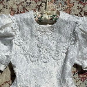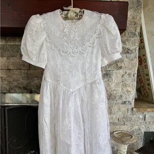Beautiful girls vintage Jessica McClintock dress. Size 8. Made in the USA. Lace overlay with satin slip. Beautiful, intricate lace detailing. Scalloped bottom. Tie back waist. Perfect for wedding, first communion, Christmas, or any special occasion. Dress in very good condition, the inside lining has been repaired, you can’t see it when wearing.