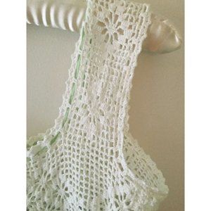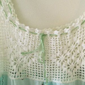 One of a kind hand made, with crochet top and vintage print satiny skirt. Bow has some fraying which is reflected in the price.