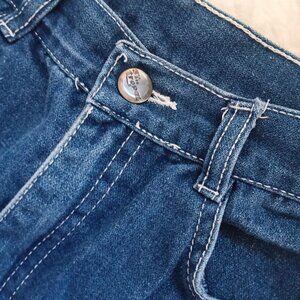 Vintage 1980's girls jeans featuring embroidered disco pockets and distressed details. Perfectly repaired for a unique retro look. These jeans offer a nostalgic flair with a modern twist, ideal for fashion enthusiasts seeking a touch of vintage charm.