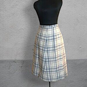 This 1970s vintage Pendleton wool midi skirt showcases a blue, beige, and purple plaid pattern and is made of 100% virgin wool. Pendleton is famous for its distinctive patterns and high-quality wool. The A-line silhouette and midi length are characteristic of vintage fashion.