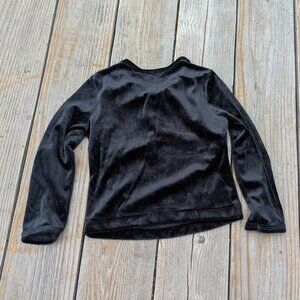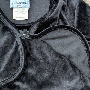 L.A. Movers Girl black velour long sleeved top from the new millenium (2000); front has layered panel brought together by a velour flower with crystal gem in the center. Non-smoking, no pet household.