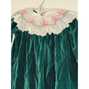 Vintage '80s toddler kids green party dress. Velvet, with a removable bow collar. Your kid can have a cute Christmas or holiday outfit and then you throw the collar on and they'll have a cute spring or easter dress.