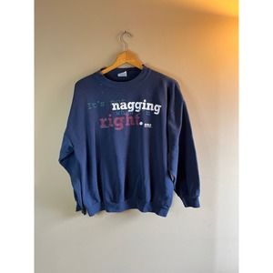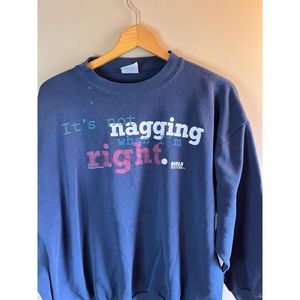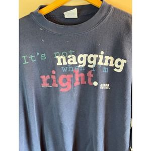 Vintage Girls With Attitude Crewneck Sweatshirt - Womens XL - 50 / 50 cotton / polyester - made in USA Ross Sportswear International tag - navy with screen printed "It's not nagging when I'm right" - some small bleach stains