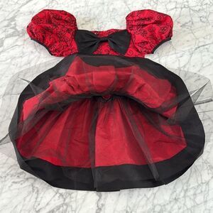 Puffy sleeve with exaggerated bow with tie to back. Tulle layering adds flounce to the skirt.