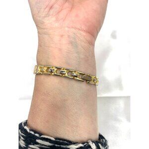 This vintage Gitanoe watch combines elegance and functionality in a classic design. Its gold-tone bracelet and diamond accents provide a sophisticated look, while the quartz movement ensures precise timekeeping. The watch's vintage appeal makes it a timeless addition to any collection. Full working order, new battery installed. Good preowned condition with some dust behind watch glass.