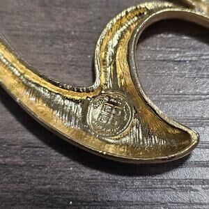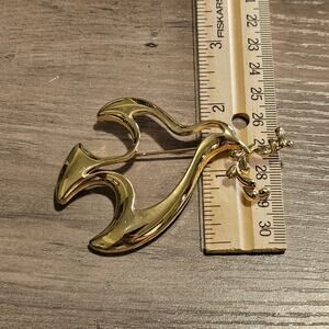 Silhouette of a Dove with an open center. Dove is holding a peace branch in its mouth. Gold tone.