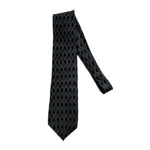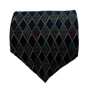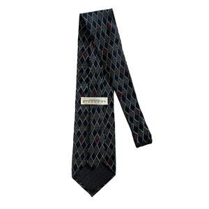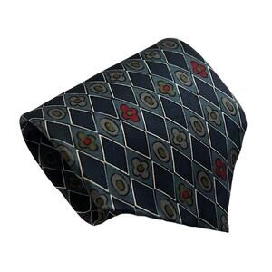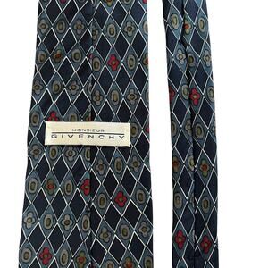 Stylish vintage Givenchy Monsieur tie in luxurious 100% silk. Features a striking diamond geometric pattern with floral details, in rich tones of navy blue, olive, red, and gray. Perfect for collectors or for elevating any professional or formal outfit.