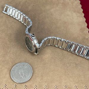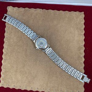 Vintage Givenchy Paris Watch Stainless Steel, Black face, Silver Hands and Raised Markers, Roman Numerals. Mineral Crystal has some scratches and top bracelet Link Bracelet is 7.75 with all links installed back of case is stainless steel Back of Bracelet Marked Stainless Steel With Givenchy Logo on Buckle Signed LT.09.XVII Reg 1112751 pre owned new battery serviced see pictures for true detail