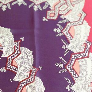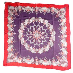 This vintage Givenchy silk scarf features an eye-catching medallion-style print in shades of deep purple, red, and ivory. The symmetrical design radiates from the center in intricate, lace-like patterns, bordered by a bold red frame that adds drama and elegance.