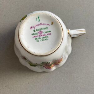 Vintage Gladstone Chrysanthemum Scalloped Gold Trim Teacup and Saucer Set, 1960