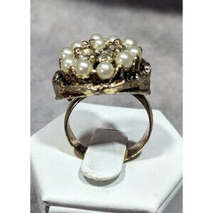 Vintage Glam Gold Tone Rhinestone Seed Pearl Adjustable Ring Size 6