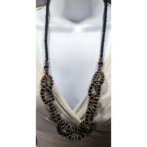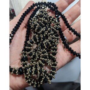This stunning vintage necklace features a glamorous blend of metal and glass beads. Its loop design makes a bold statement, perfect for special occasions or everyday elegance.